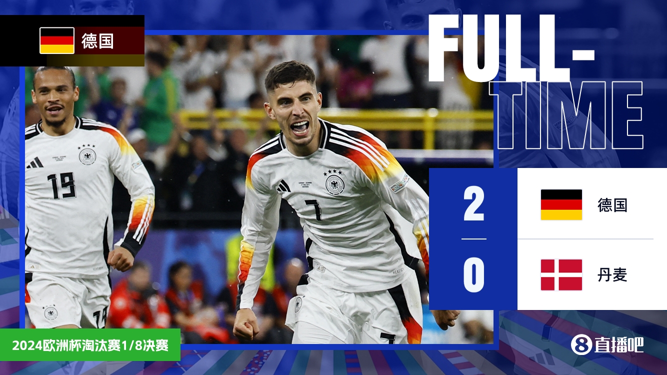 6月30日讯 欧洲杯1/8决赛,德国对阵丹麦。上半场,施洛特贝克闪击被吹,现场出现极端雷暴天气比赛一度中断25分钟。易边再战,安德森破门被吹后送点,哈弗茨点射建功+失单刀,穆西亚拉单刀建功,补时阶段维尔茨破门被吹。最终,德国2-0丹麦。