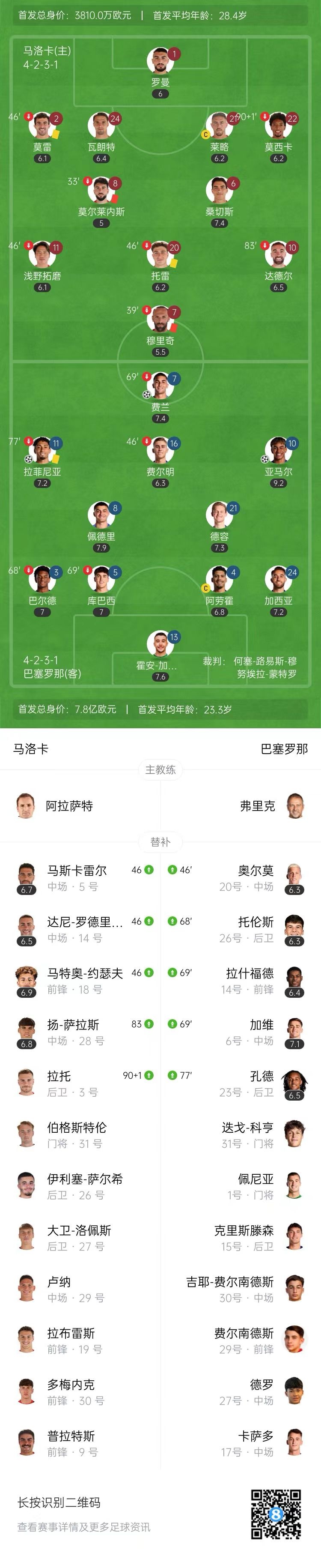 第33分钟,莫尔莱内斯绊倒亚马尔,主裁判向其出示本场比赛的第二张黄牌,将其罚下,马洛卡少打一人!↓