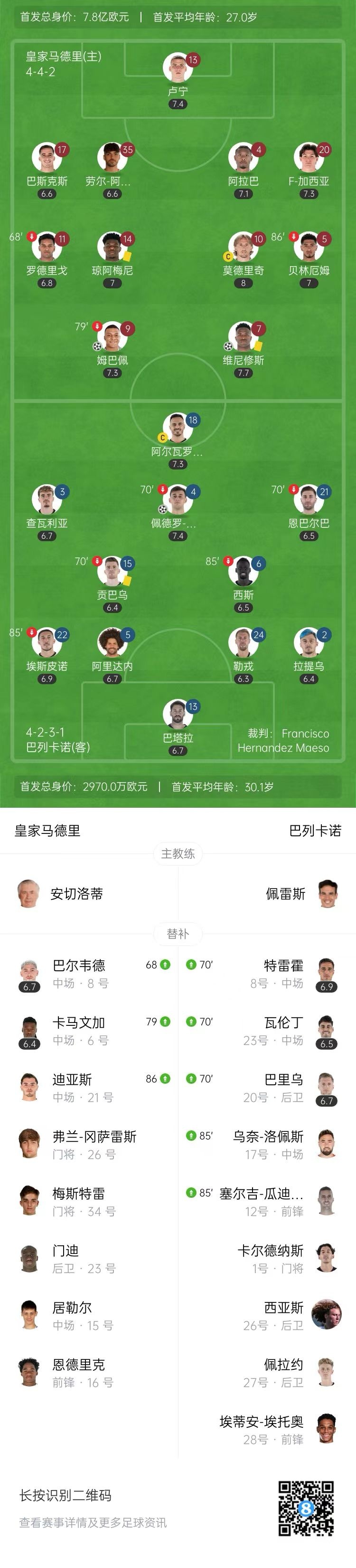 第76分钟,皇马前场断球,莫德里奇左侧横敲中路,维尼修斯跟进抢点偏出。↓