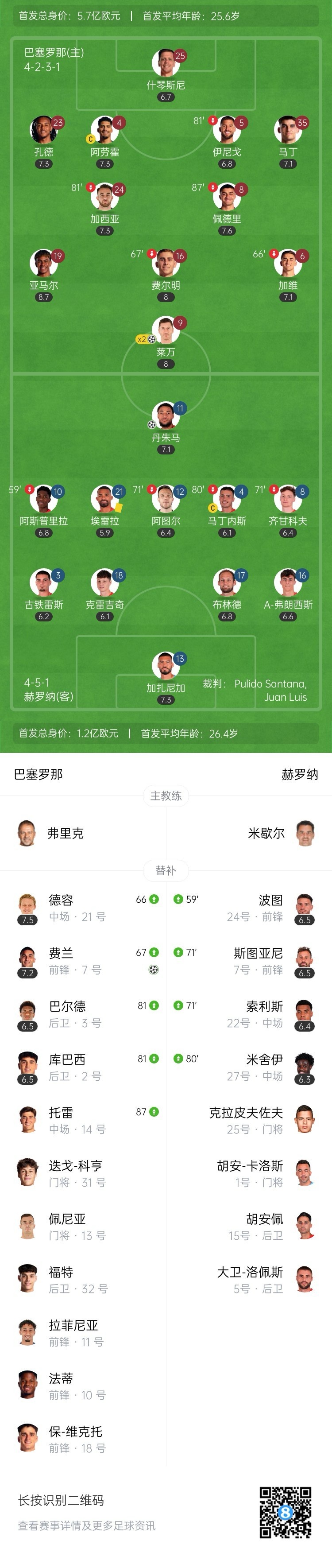 全场比赛结束,巴塞罗那4-1双杀赫罗纳。