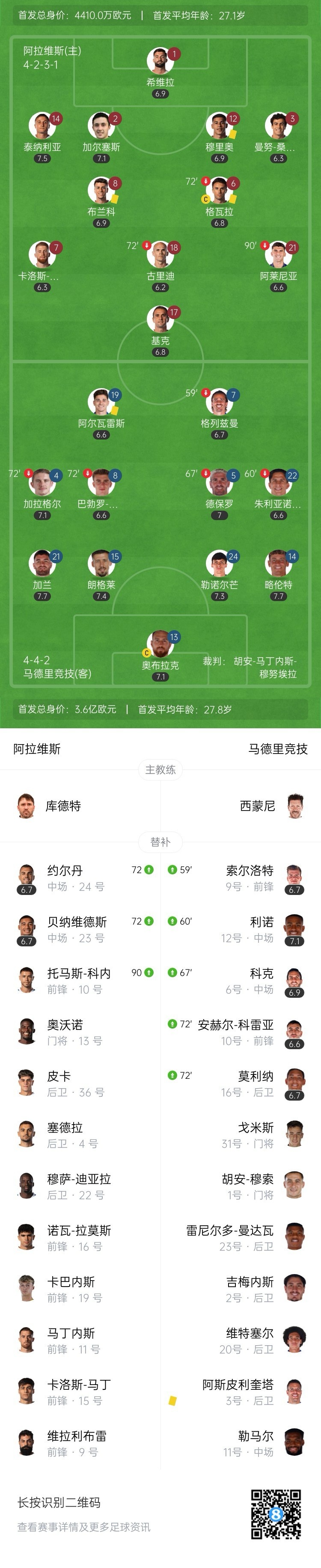 全场比赛结束,马竞客场0-0闷平阿拉维斯。