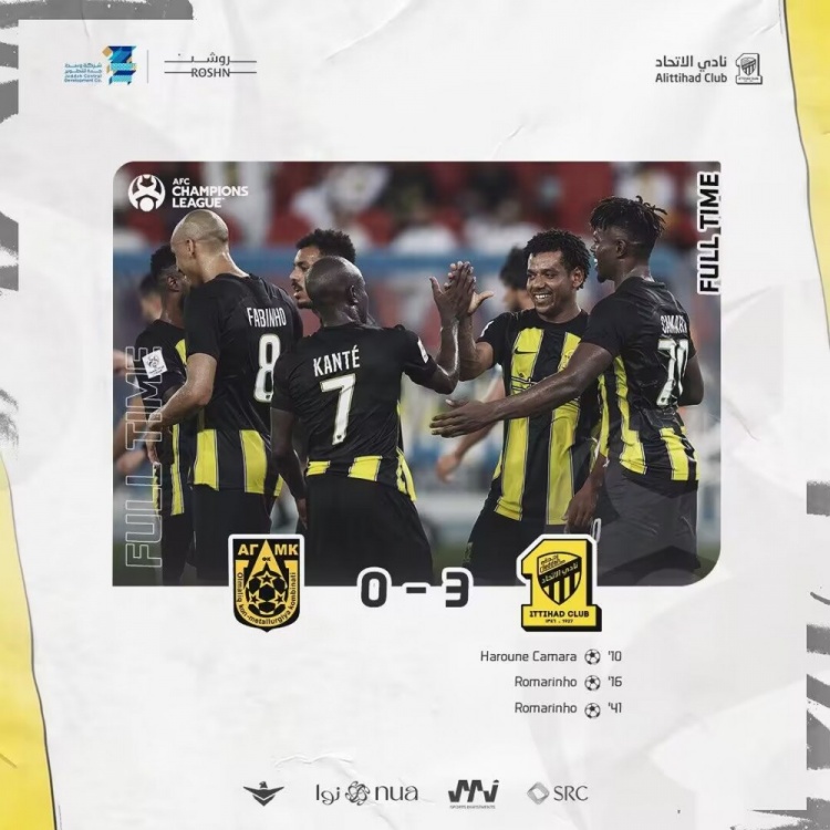 罗马里尼奥点射破门,吉达联合3-0阿尔马雷克。↓