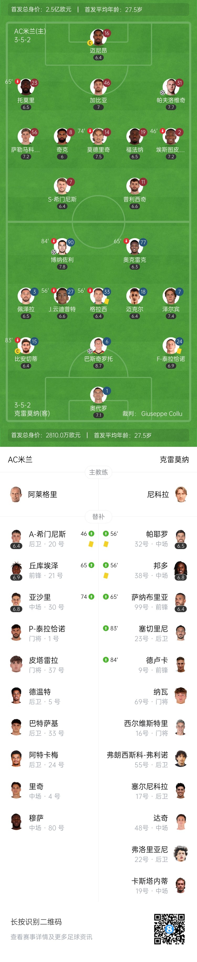 下半场伤停补时4分钟,全场比赛结束,最终AC米兰1-2克雷莫纳。
