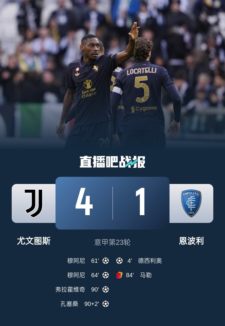 2月2日讯 北京时间2月2日晚上19:30,意甲第23轮,尤文图斯坐镇安联竞技场挑战恩波利。上半场,德西利奥首开记录。下半场,穆阿尼三分钟梅开二度,马勒染红,弗拉霍维奇破门,孔塞桑锦上添花。全场结束,尤文图斯4-1恩波利。