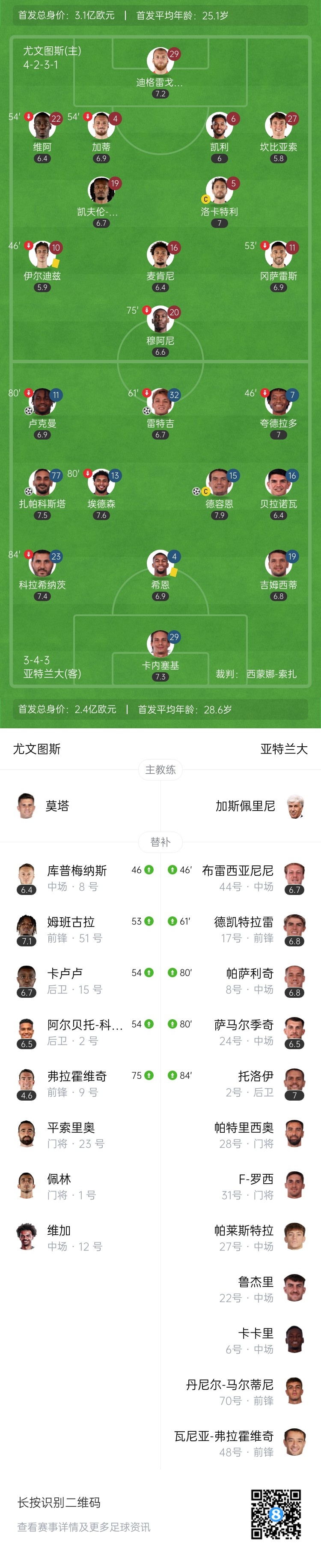 第46分钟,凯利后场出球失误被断送礼,亚特兰大推进反击,禁区左侧卢克曼小角度打门被门将扑出,门前雷特吉再打也被封堵,德容恩无人盯防得球再补射入网,尤文主场0-2落后↓