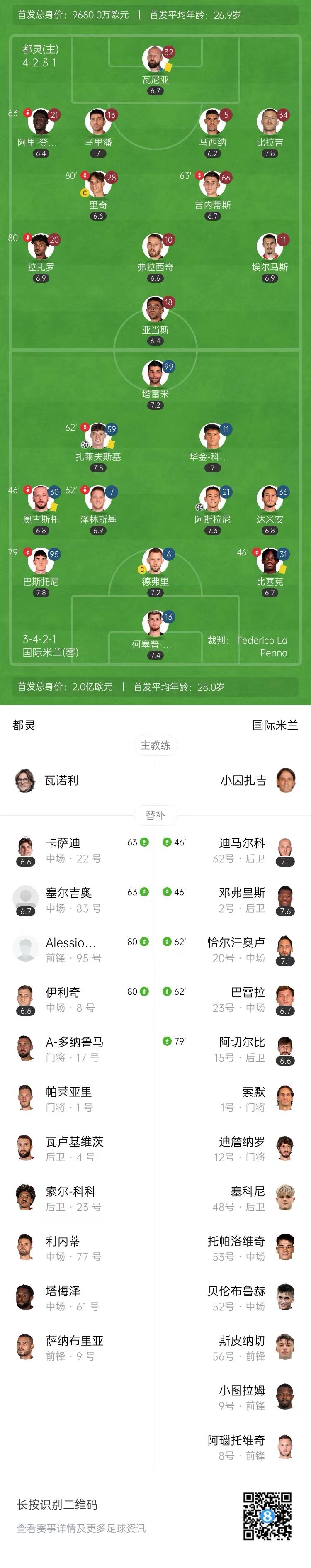 第67分钟,国米反击,中路扎莱夫斯基包抄被门将铲出,跟进补射又被门将飞身封堵。↓