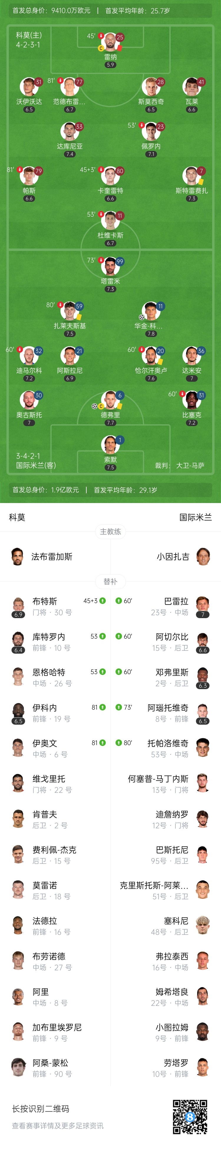 下半场补时3分钟。最终全场比赛结束,科莫0-2国米。
