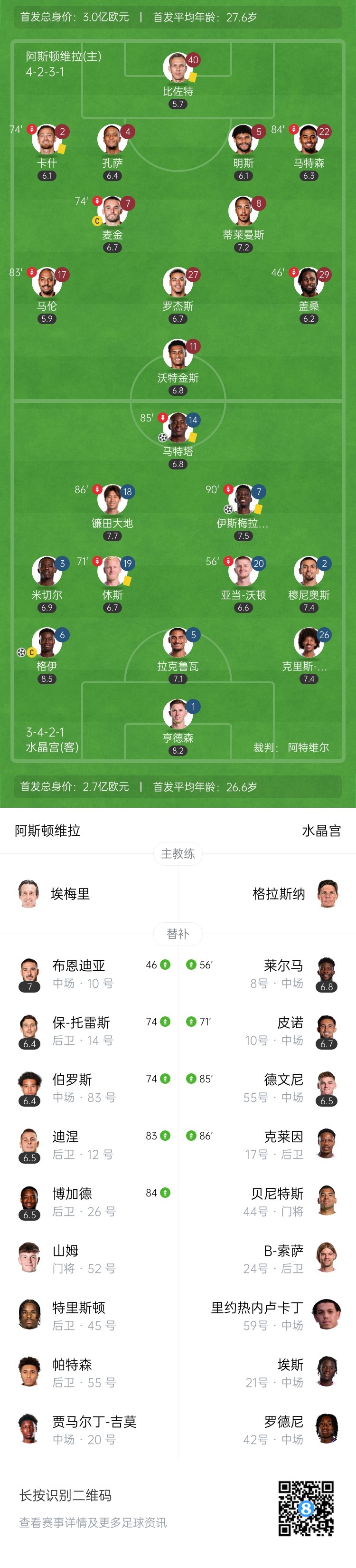 第78分钟,水晶宫右侧边线球,大力扔进禁区,前点拉克鲁瓦头球后蹭,后点伊斯梅拉-萨尔头球接力破门!水晶宫3-0领先维拉↓