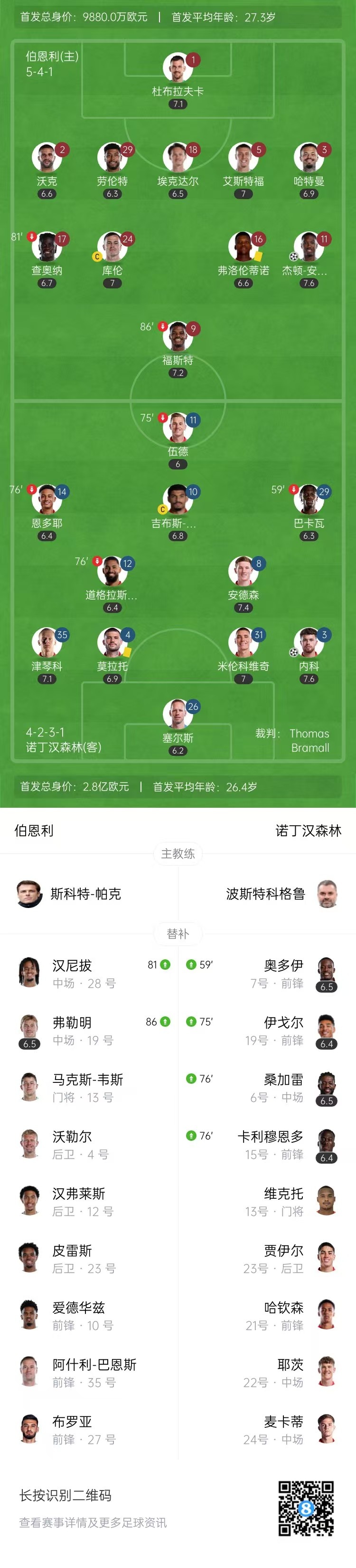 全场比赛结束,伯恩利1-1诺丁汉森林。