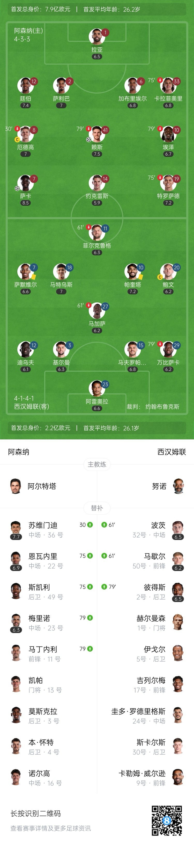 萨卡进球越位!第24分钟,赖斯中场长传,萨卡杀入禁区抢射破门,裁判迅速示意萨卡越位进球无效。↓