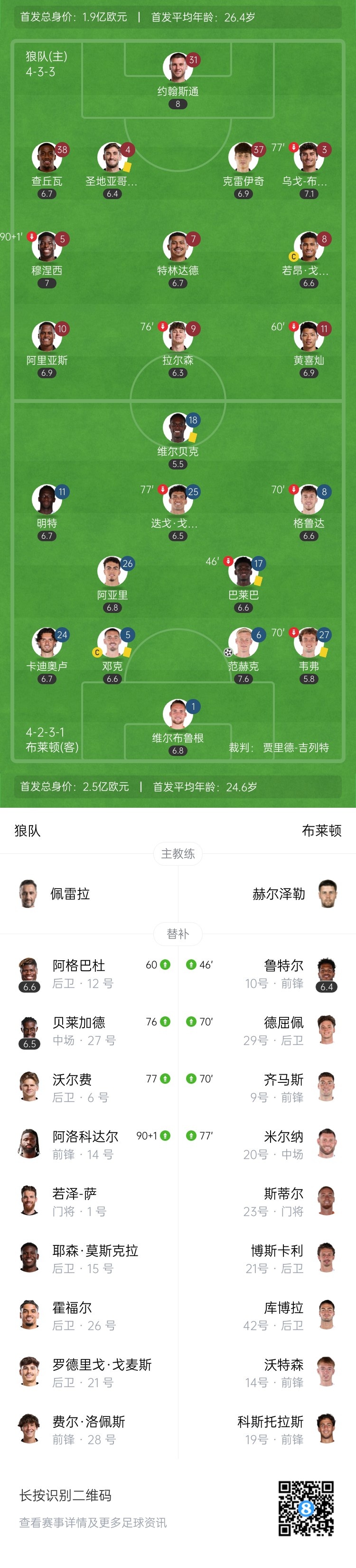 下半场伤停补时5分钟,全场比赛结束,最终狼队1-1布莱顿。