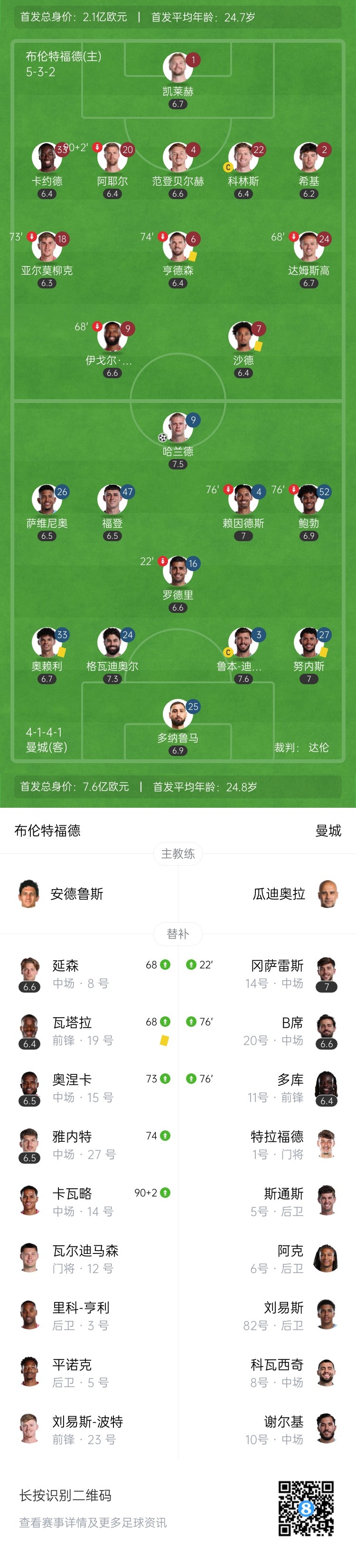 10月6日讯 北京时间23:30,英超第7轮曼城客场挑战布伦特福德,比赛在布伦特福德社区球场打响!上半场,哈兰德扛人抽射破门,罗德里无对抗情况下伤退。下半场,多纳鲁马扑出伊戈尔-蒂亚戈单刀!最终,曼城1-0击败布伦特福德,英超4轮不败升至第5!