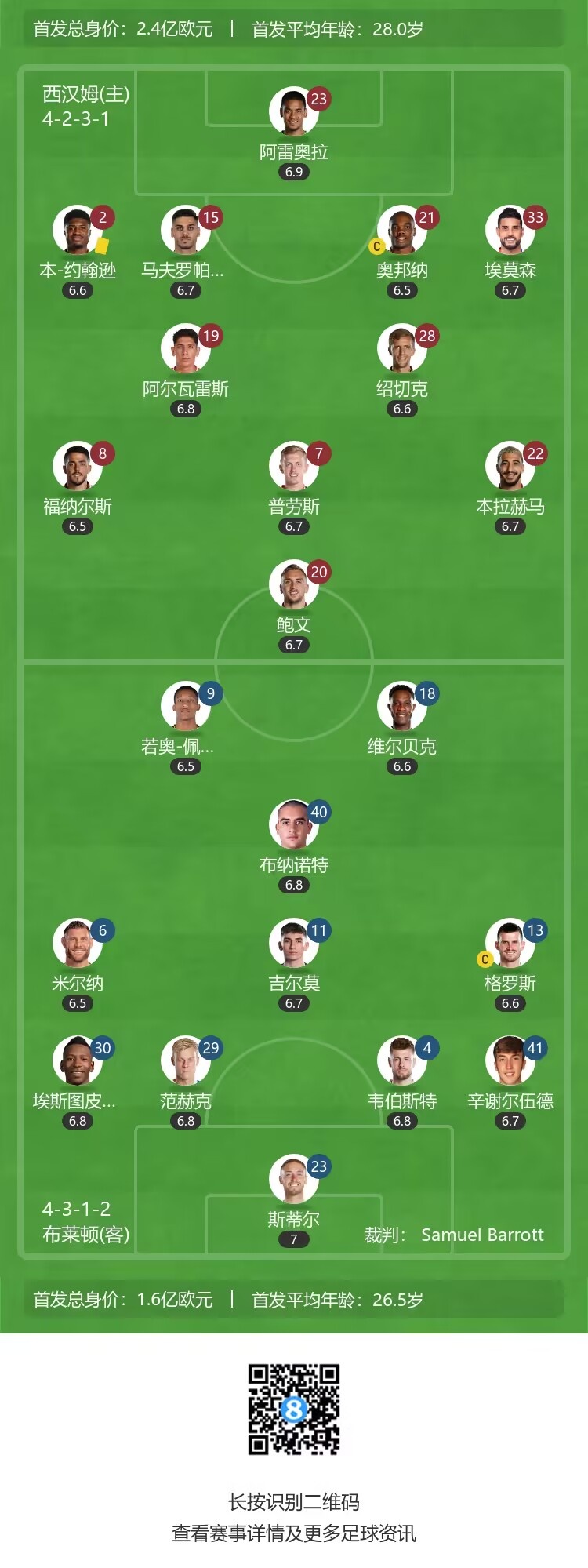 1月3日讯 北京时间3:30,英超第20轮西汉姆联主场迎战布莱顿。上半场鲍文击中立柱,下半场绍切克失良机,双方门将屡献神扑。最终,西汉姆联0-0战平布莱顿,西汉姆联仍居第6,布莱顿凭借净胜球优势超越曼联,升至第7。