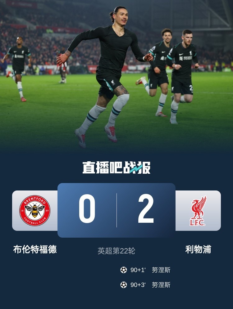 第92分钟,努涅斯禁区左侧得球一脚爆射梅开二度,利物浦2-0布伦特福德。↓