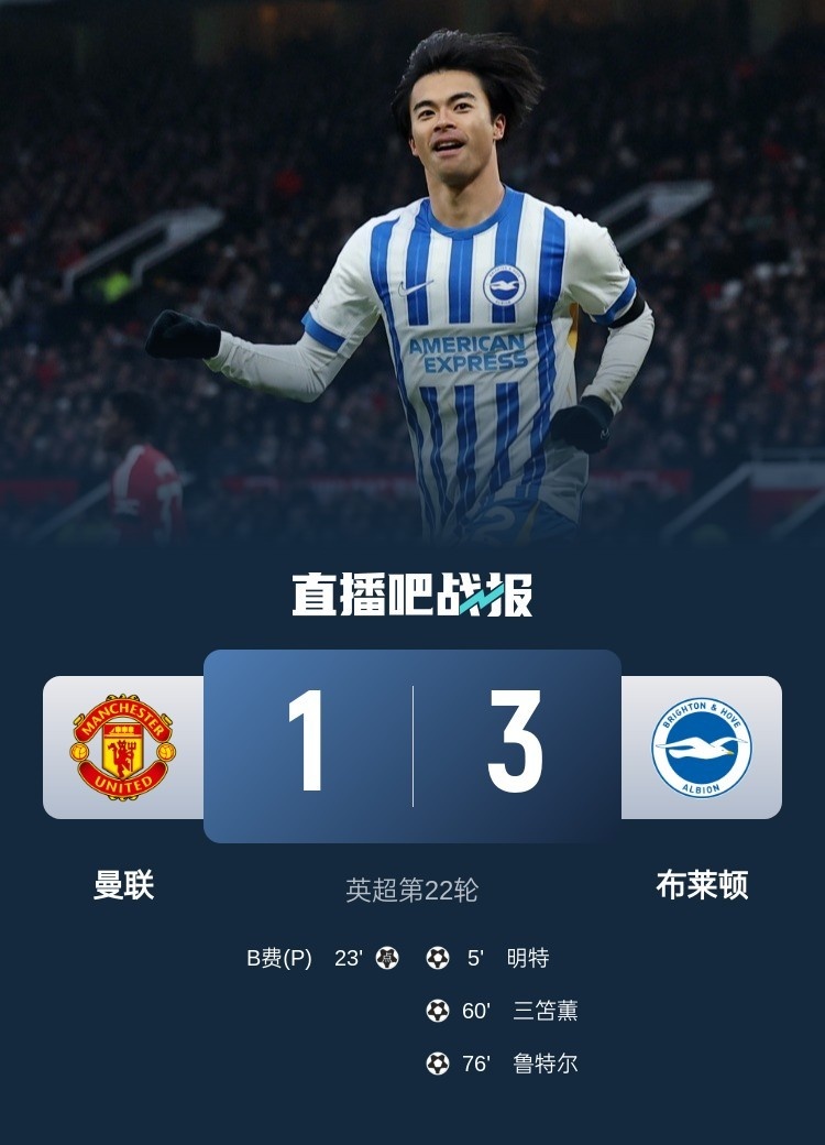 1月19日讯 北京时间1月19日晚22时整,2024-25赛季英超第22轮在老特拉福德球场展开角逐,曼联主场迎战布莱顿。上半场红魔开场5分钟丢球,三笘薰世界级停球+无私助攻,齐尔克泽造点,B费点射扳平,下半场三笘薰破门+加冕日本球员英超射手王,奥纳纳离谱脱手送礼。最终曼联主场1-3不敌布莱顿,曼联近6轮联赛仅取得1胜+各赛事3场不败遭终结。积分榜方面,曼联积26分仍居第13名,布莱顿积34分升至第9。
