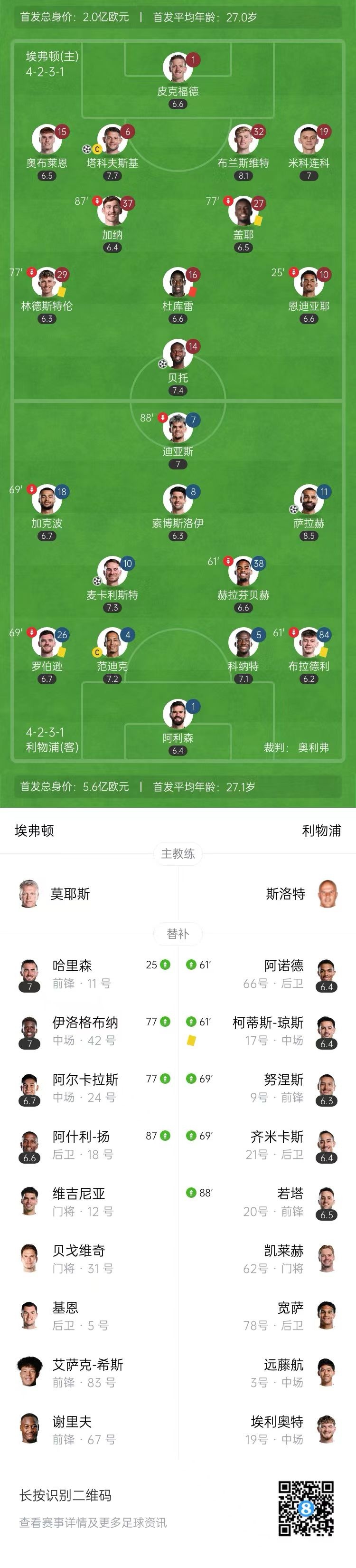第67分钟,埃弗顿角球开出,禁区内头球摆渡,奥布莱恩压住范迪克头球一做,布兰斯维特前点破门,但越位在先,进球无效。↓