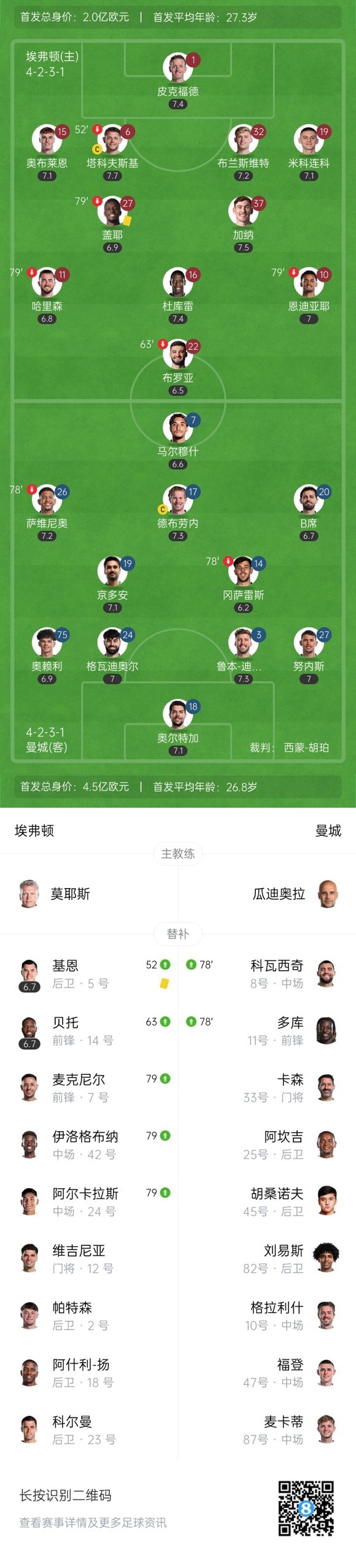 第83分钟,曼城打破僵局!B席右路横传努内斯下底传到门前奥赖利包抄推射破门,埃弗顿0-1曼城。↓