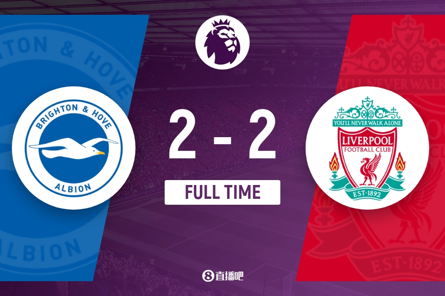 全场比赛结束,利物浦2-2战平布莱顿。