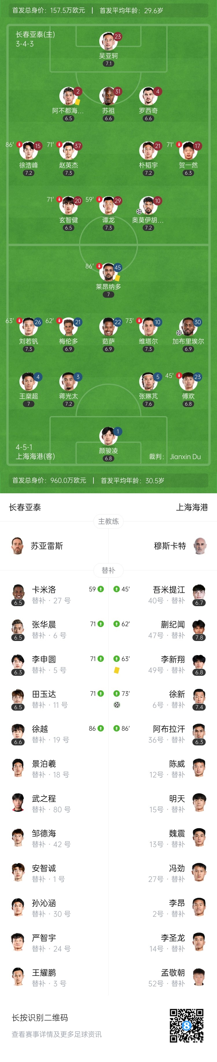 下半场补时11分钟。最终全场比赛结束,长春亚泰1-3上海海港。