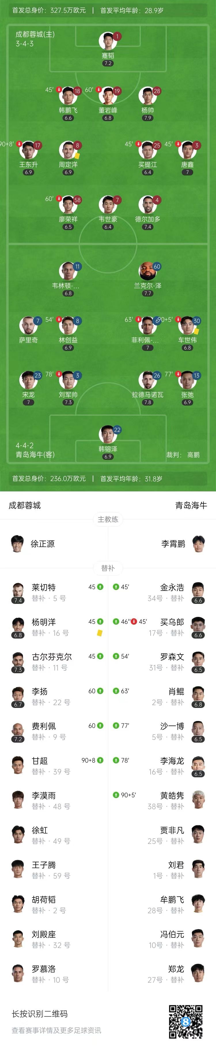 8月16日讯 北京时间8月16日20:00,中超第21轮,成都蓉城坐镇主场双流体育中心迎战青岛海牛。上半场,蹇韬两连扑救险,尼古拉远射造险。下半场,韦世豪反击抽射打飞错失良机,肖鲲头球中柱。最终,成都蓉城主场0-0战平青岛海牛,联赛三连胜遭到终结。21轮战罢,成都蓉城13胜5平3负积44分,位居第4位;青岛海牛3胜6平12负积15分,仍位居倒数第二位。