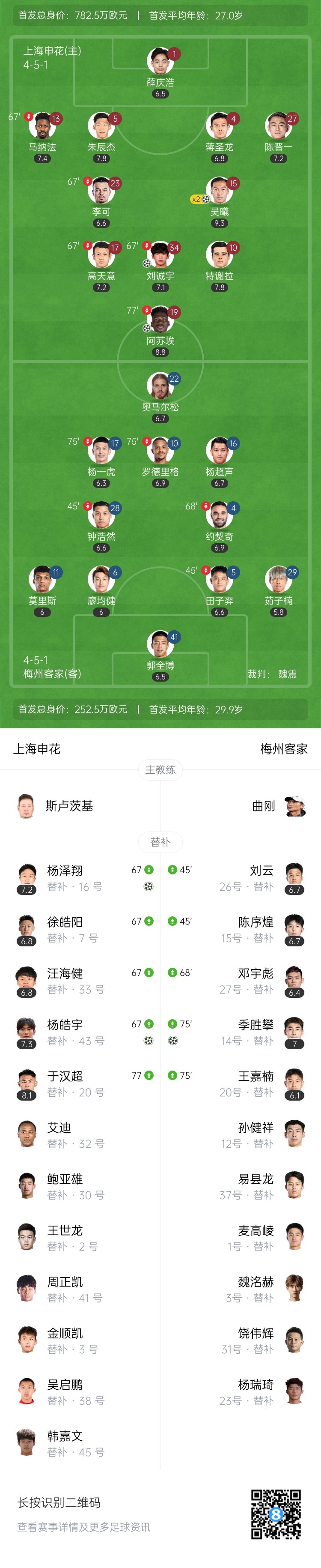 下半场补时7分钟。最终全场比赛结束,上海申花6-1梅州客家。