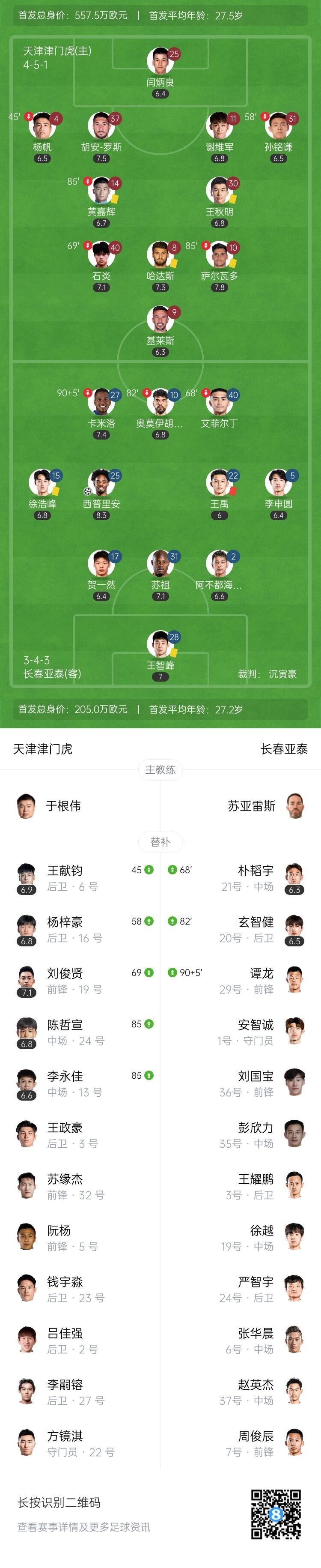伤停补时9分钟。全场比赛结束,天津津门虎2-2长春亚泰。