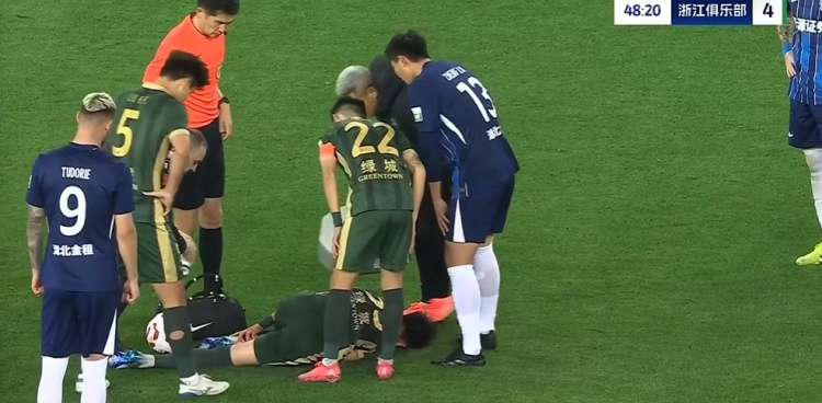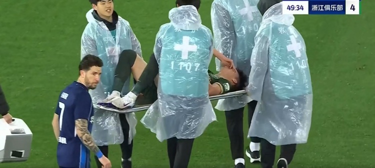 第49分钟,王钰栋拼抢中被郑凯木踩到脚踝后痛苦倒地,担架进场将王钰栋抬出场外,郑凯木被黄牌警告↓