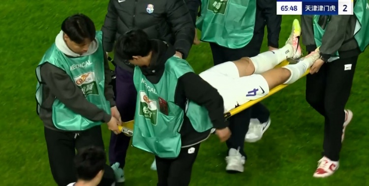 杨帆伤退!第65分钟,杨帆争顶时落地受伤,随后被担架抬出场外。↓