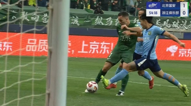 第55分钟,国安中场抢点后快速反击,法比奥向前直塞做球,塞尔吉尼奥跟进绝佳机会面对补防的汪士钦打偏了↓