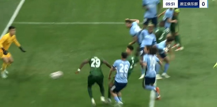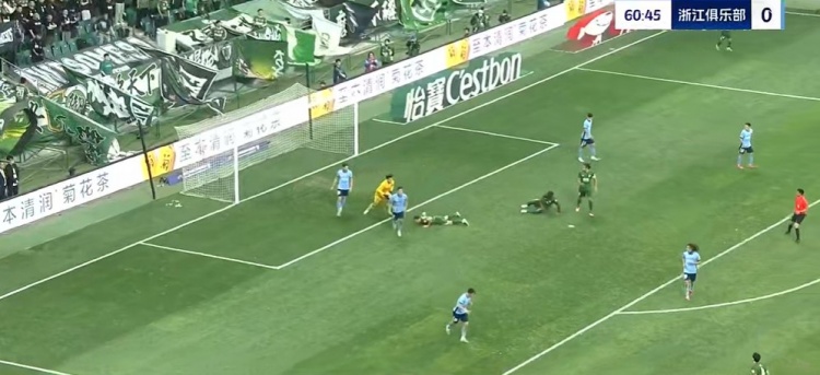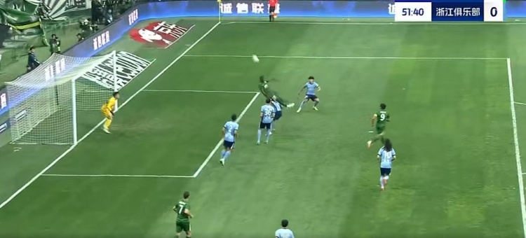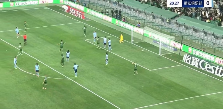 第45+2分钟,浙江队大禁区左侧定位球机会,李提香主罚开到后点,卢卡斯高高跃起顶出弹地球没有力量,门将轻松没收↓