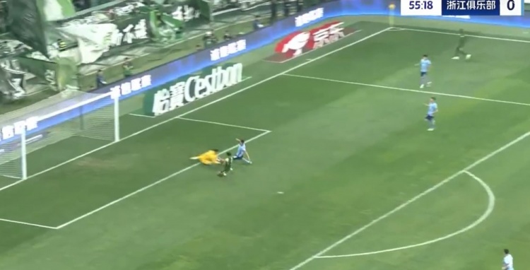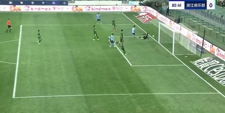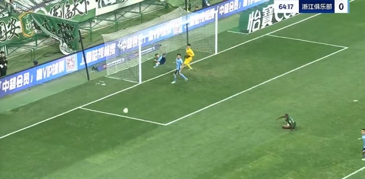 第65分钟,韩佳奇大脚开出,张玉宁头球摆渡,法比奥跟进形成绝佳的单刀机会,赵博出击勉强碰到法比奥的单刀射门,皮球减速后缓缓滚向球门,刘浩帆赶在皮球过线之前极限解围↓