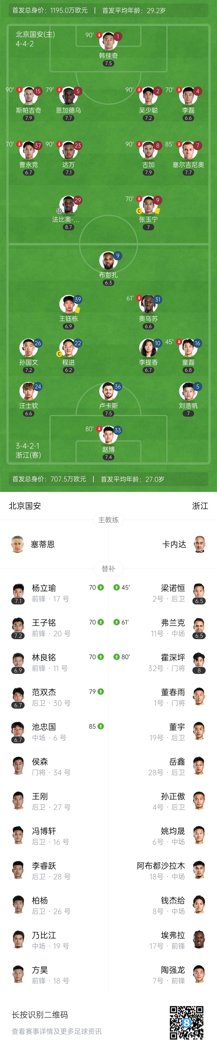 下半场补时9分钟。最终全场比赛结束,国安2-0浙江。