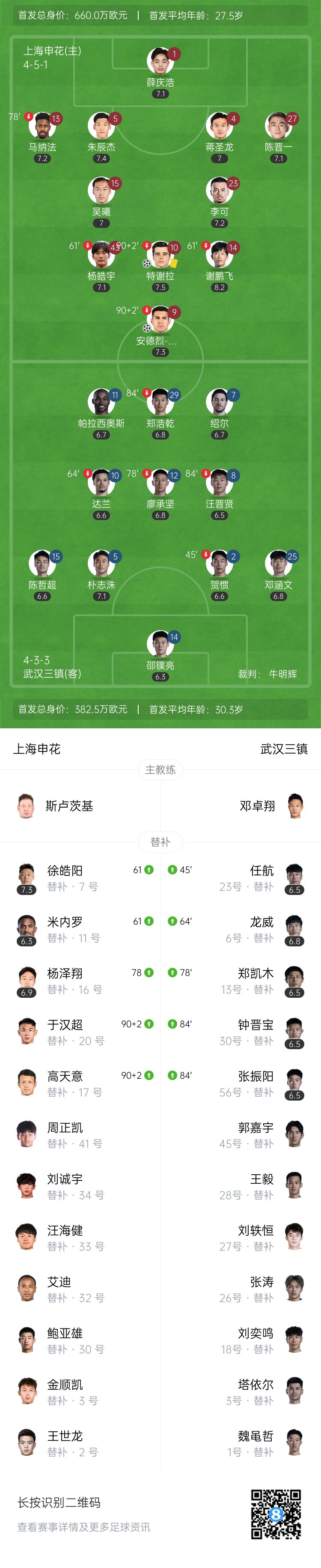 下半场补时8分钟。最终全场比赛结束,申花2-0三镇。