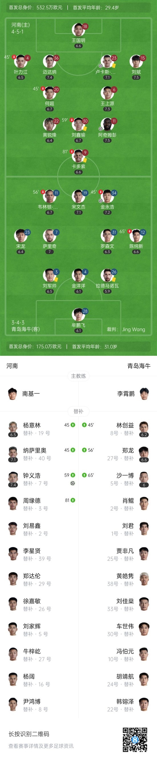下半场补时6分钟,河南3-1青岛海牛。