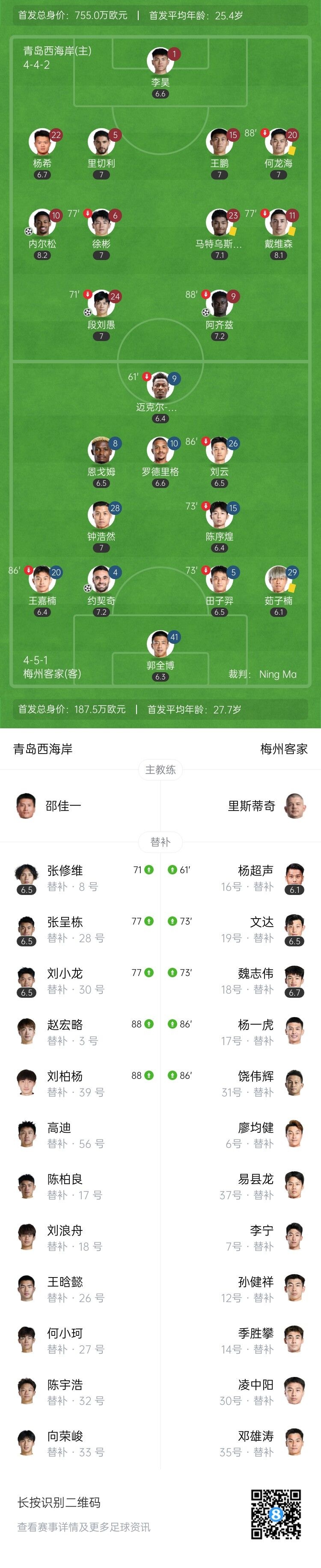 伤停补时7分钟。全场比赛结束,青岛西海岸3-1梅州客家。