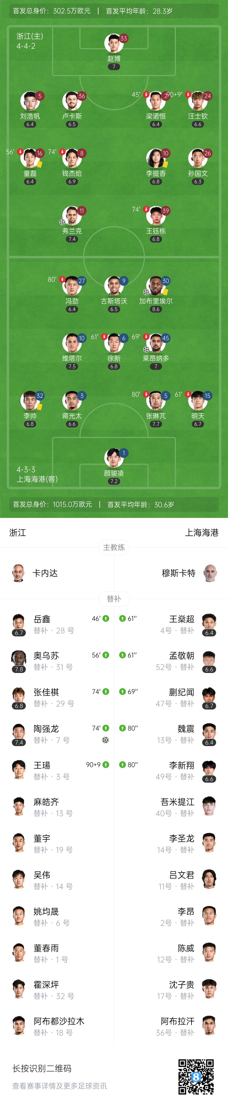 下半场补时11分钟。最终全场比赛结束,浙江队2-2上海海港。