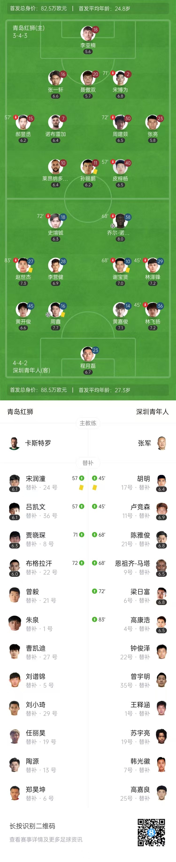 第54分钟,深圳左路角球开到后点,周鑫冲顶头球得分,深圳青年人2-0青岛红狮。↓