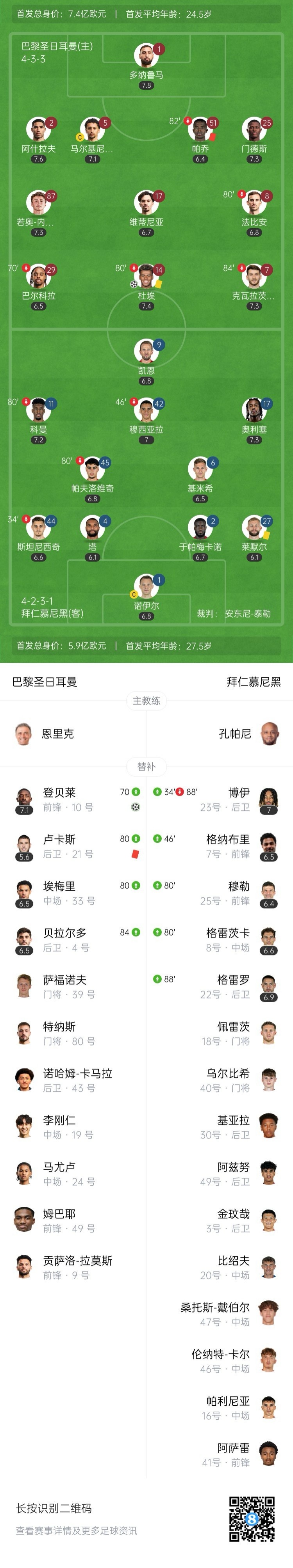 全场比赛结束,九人巴黎圣日耳曼2-0战胜拜仁慕尼黑晋级四强。