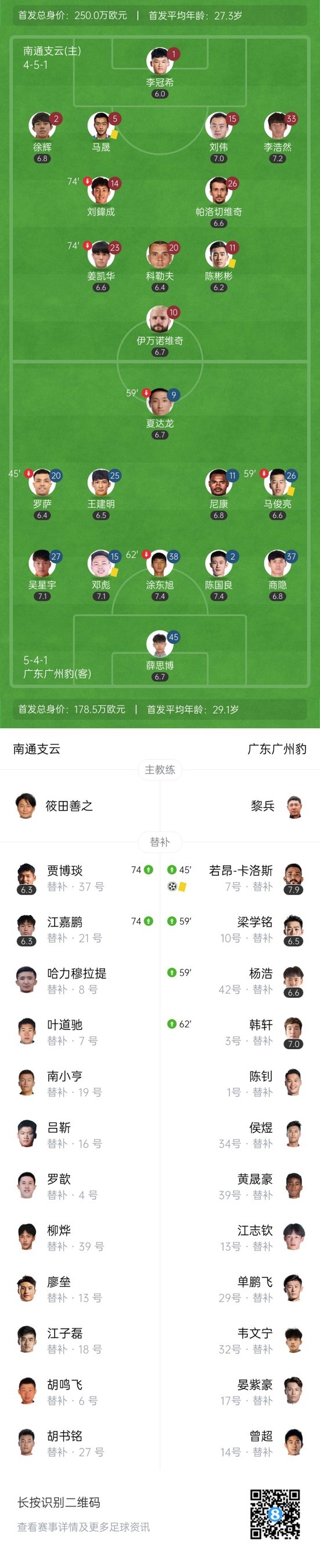 下半场补时8分钟,南通支云0-1广东广州豹。