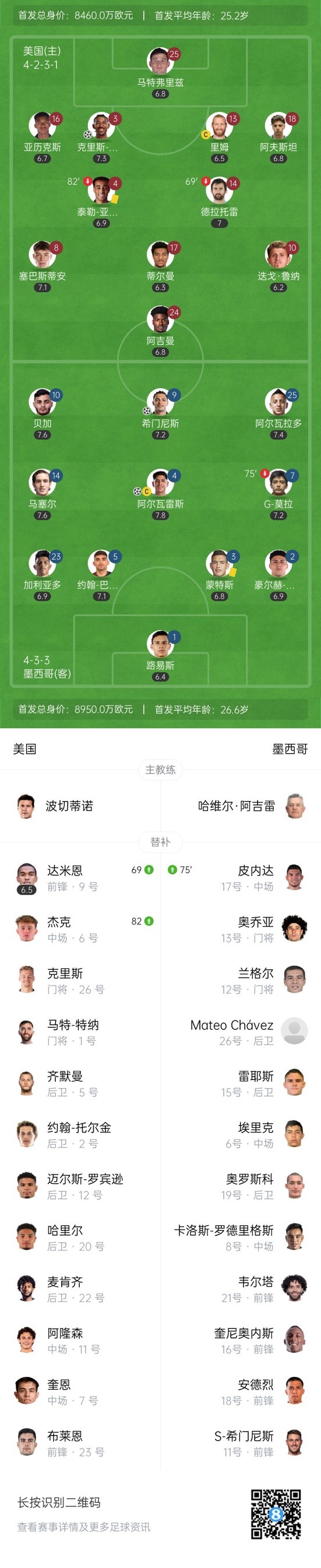第76分钟,墨西哥反超比分!左路定位球开到禁区前点巴斯克斯头球后蹭到门前阿尔瓦雷斯头球破门,随后裁判吹罚越位在先进球无效,然后var提示阿尔瓦雷斯没有越位进球有效,美国1-2墨西哥。↓