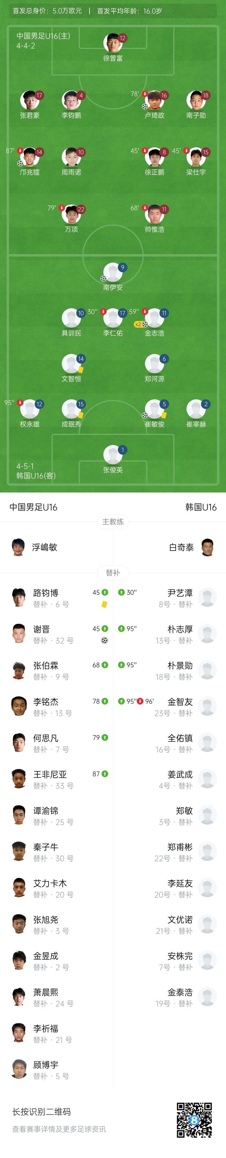 第43分钟,韩国国少队左路进攻打到禁区中路,南伊安背身将球敲到右路,金志浩劲射破门梅开二度,国少队1-2落后韩国队。↓
