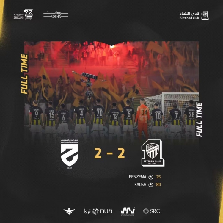 第78分钟,吉达联合反超比分!左路角球开到禁区后点本泽马扣过防守球员后横扫门前卡德什打门球进,吉达联合2-1哈森姆。↓