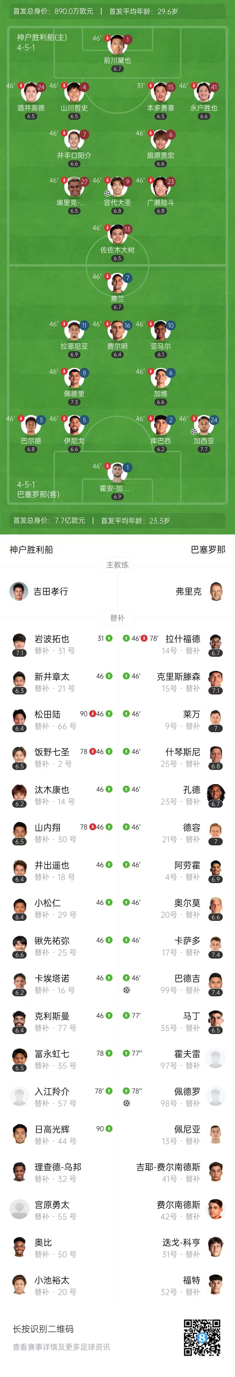 全场比赛结束,神户胜利船1-3巴塞罗那。