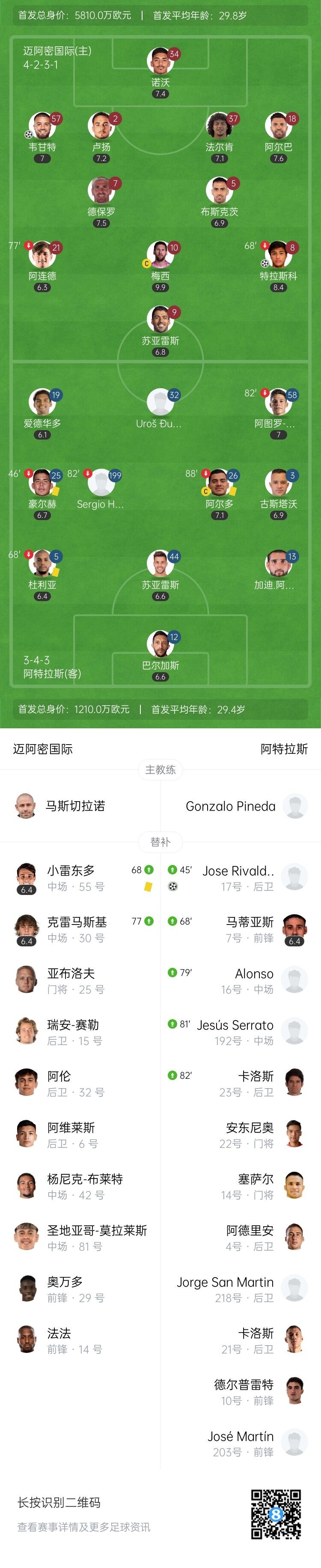 第80分钟,阿特拉斯左路完成突破,埃尔南德斯造成门前混乱,洛萨诺补射得分!1-1!阿特拉斯扳平比分↓!