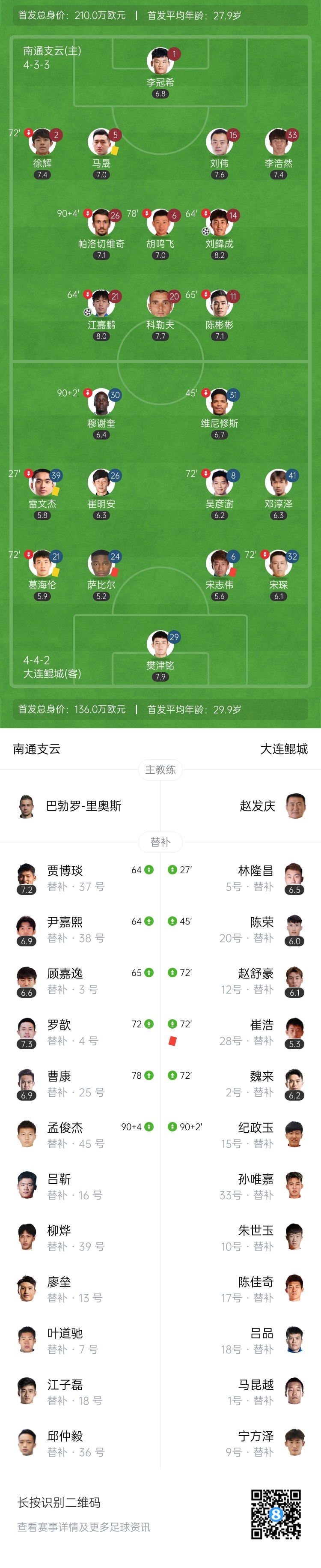 8月16日讯 北京时间8月16日19:00,中甲第21轮,南通支云坐镇主场迎战大连鲲城。上半场,刘鍏成破门为南通支云首开纪录,江嘉鹏破门扩大比分优势!萨比尔两黄变一红被罚下,半场战罢,南通支云暂-大连鲲城;下半场,宋志伟、崔浩先后吃到红牌,双方再无进球出现!全场比赛结束,南通支云2-0大连鲲城!