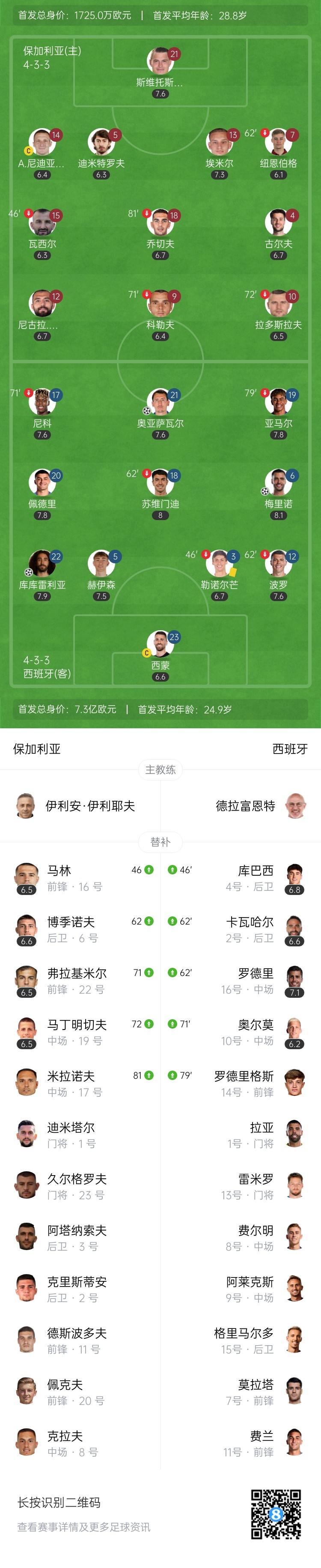9月5日讯 世预赛欧洲区小组赛E组第5轮,保加利亚坐镇主场瓦希尔列夫斯基国家体育场迎战西班牙。上半场,奥亚萨瓦尔、库库雷利亚、梅里诺先后建功。易边再战,梅里诺中框。最终保加利亚0-3西班牙。积分榜方面,西班牙3分领跑,保加利亚0分垫底。
