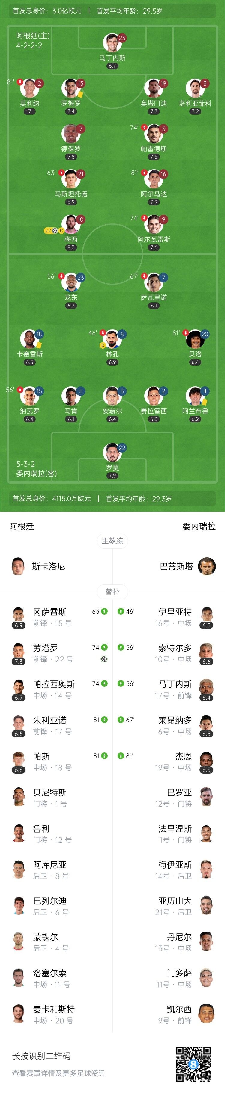 9月5日讯 北京时间9月5日早上7:30,世预赛南美区第17轮,阿根廷主场迎战委内瑞拉。上半场,阿尔瓦雷斯助攻梅西破门。下半场,梅西、阿尔马达失良机,劳塔罗替补头球得分,梅西双响。全场结束,阿根廷3-0委内瑞拉。