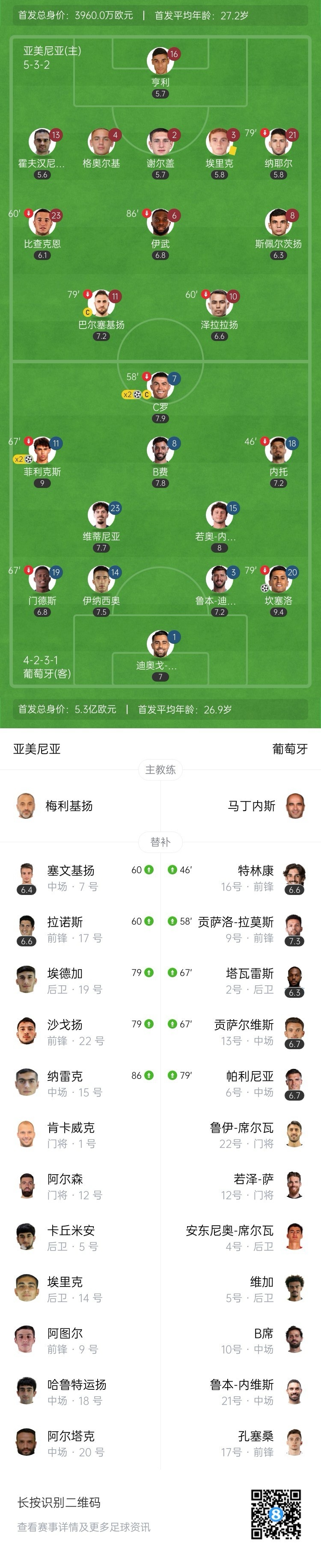 全场比赛结束,葡萄牙客场5-0大胜亚美尼亚。