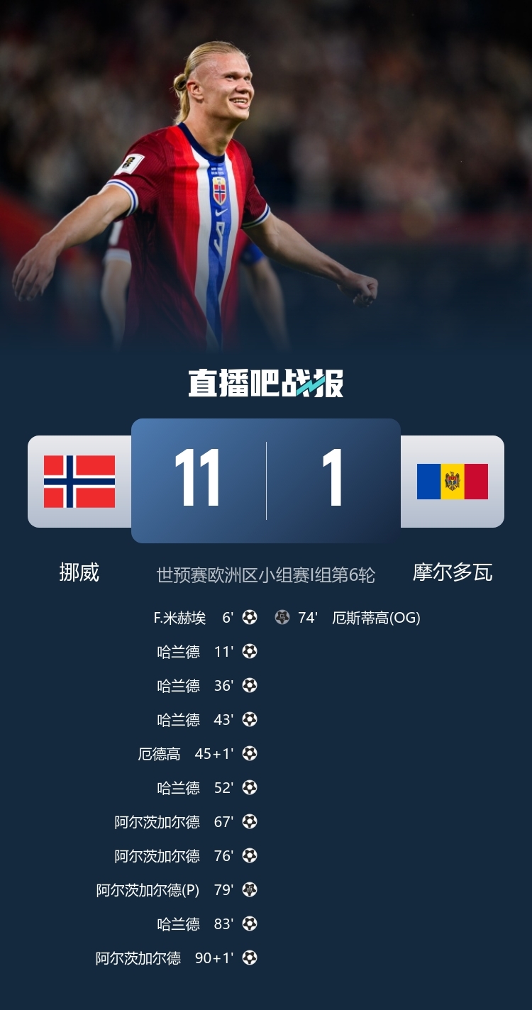 下半场第52分钟,哈兰德破门。第67分钟、76分钟、79分钟,阿尔茨加尔德连入3球。第83分钟,哈兰德打入第10球。补时阶段,阿尔茨加尔德再入一球,挪威11-1摩尔多瓦。