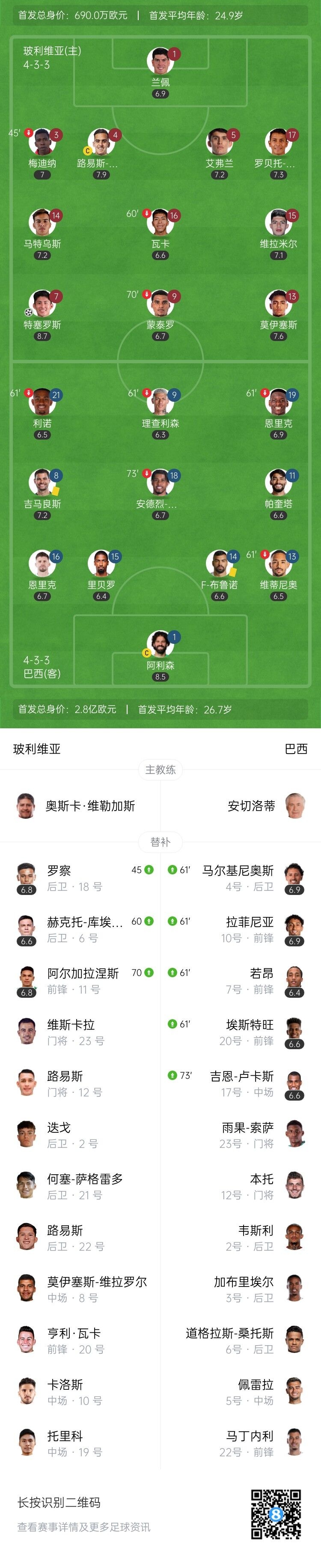 第7分钟,玻利维亚外围突施冷箭,阿利森注意力集中将球扑出。↓
